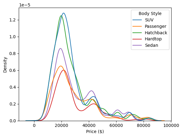 =df,x='Price ($)',hue='Body Style') sns.kdeplot(data